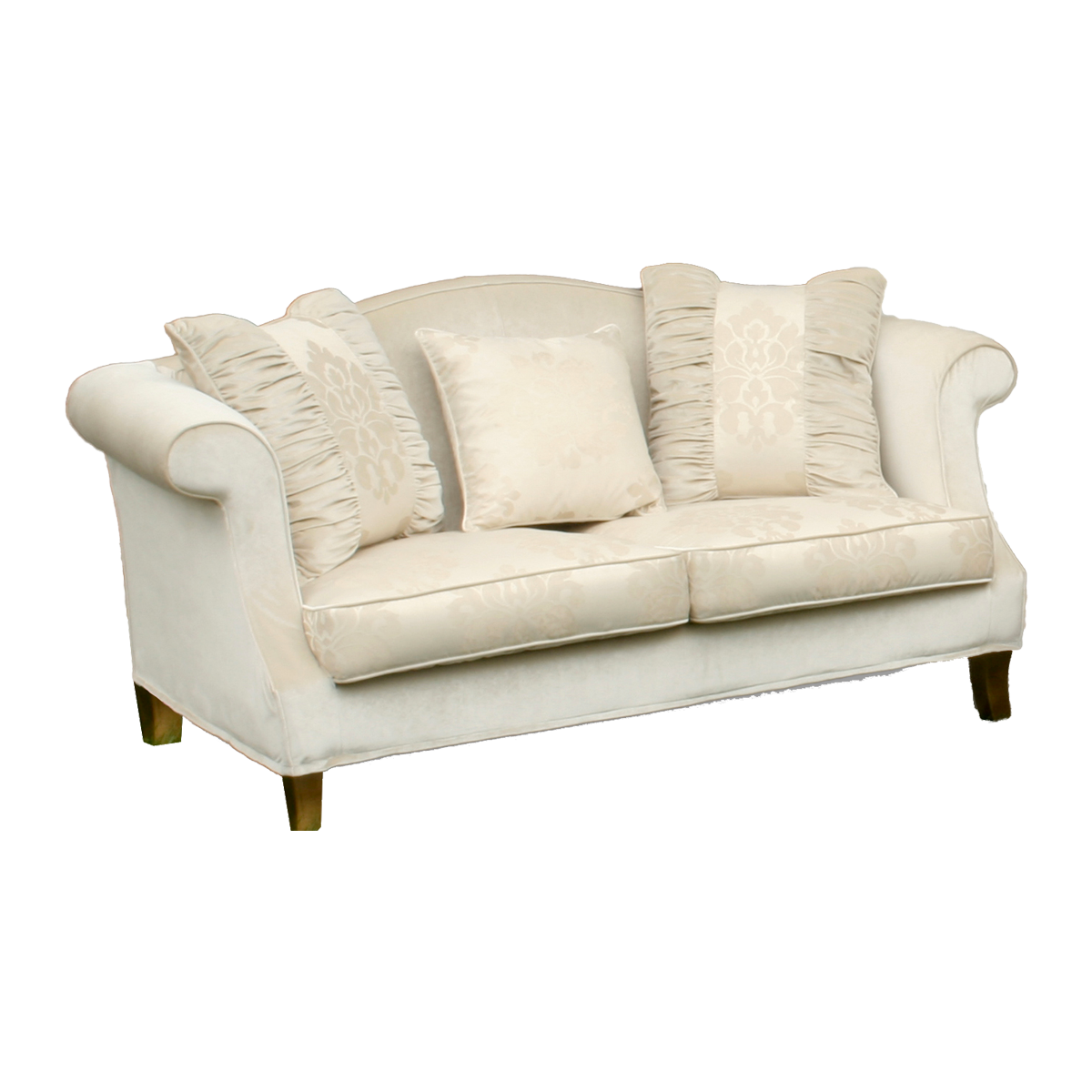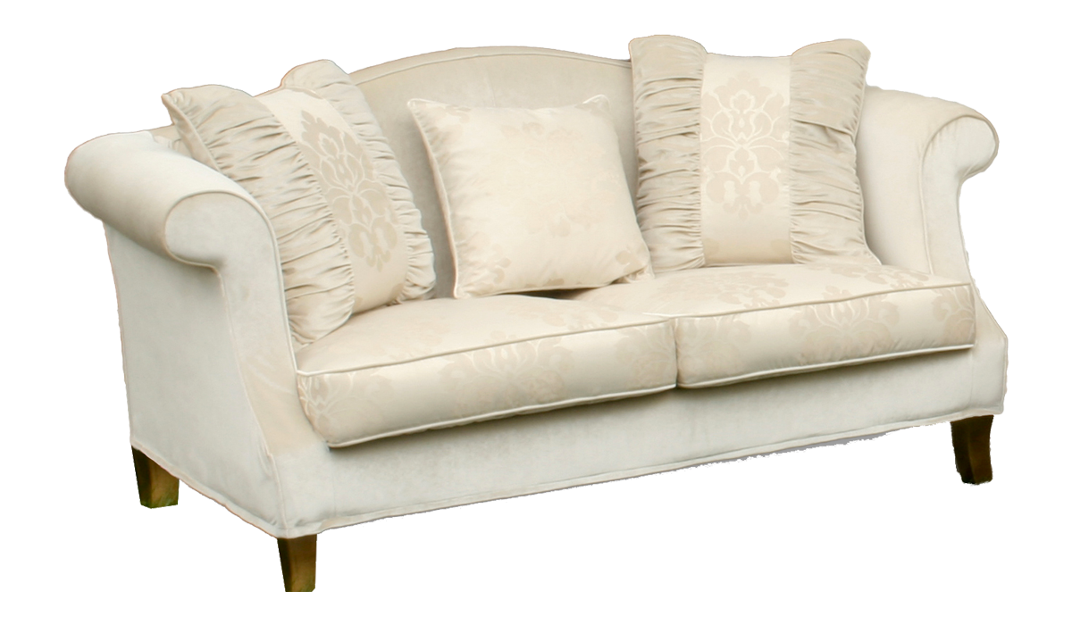 Struttura in legno di abete piallato a mano. Molleggi a nastri elastici intrecciati in caucciù rivestito. Imbottitura della scocca in poliuretano espanso a densità differenziata. Foderina realizzata con cotone 100% di colore neutro accoppiato con supporto di vellutino poliammidico termofissato.  Cuscini seduta in poliuretano espanso a quote differenziate. Eventuali cuscinetti in appoggio in piuma d’oca lavata e sterilizzata.