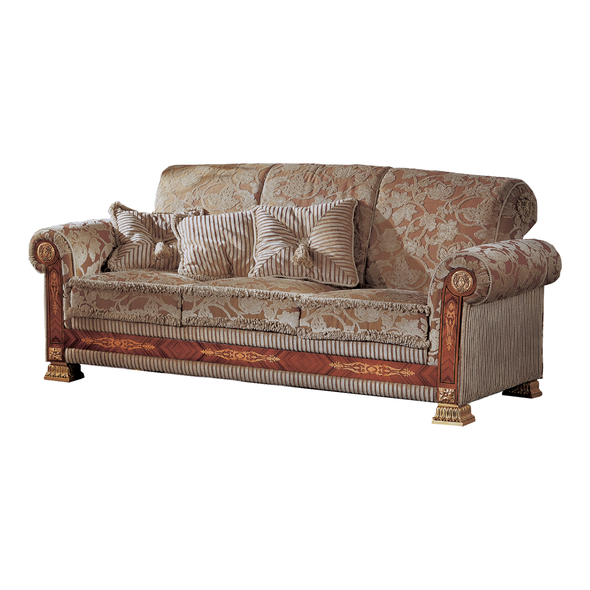 Una poltrona dallo stile imperiale, si manifesta nella sua imponenza attraverso linee decise, seguite dal frontale in legno che ne supporta la maestosità. Anche i piedini a pinta quadrata contribuiscono a far emergere negli occhi di chi osserva “Galileo” un senso di forza e prestigio. L’attitudine alla grandezza è delineata anche dall’imbottitura: i braccioli, dalla notevole dimensione, sono impreziositi da un medaglione posto al centro, così come la cuscinatura dello schienale assume un ruolo centrale date le dimensioni e la forma a ricciolo che assume nella parte posteriore. Un divano che non passa certo inosservato, adatto a chi vuole un salotto di una certa importanza. Disponibile a richiesta su misura.