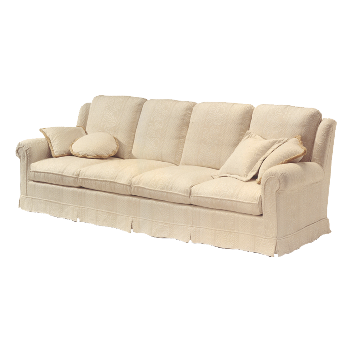 Hand-planed fir wood frame. Springing with interwoven elastic straps in coated rubber. Shell padding in differentiated density polyurethane foam. Cover made with 100% neutral colored cotton coupled with a heat-set polyamide velveteen backing. Seat cushions in multi-density polyurethane foam. Support pads in washed and sterilized goose down